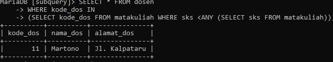 Subquery baris tunggal (scalar) hanya mengembalikan hasil satu baris data dengan dapat menggunakan operator baris tunggal =, >, >=, <, <=, atau <>, seperti gambar ini
