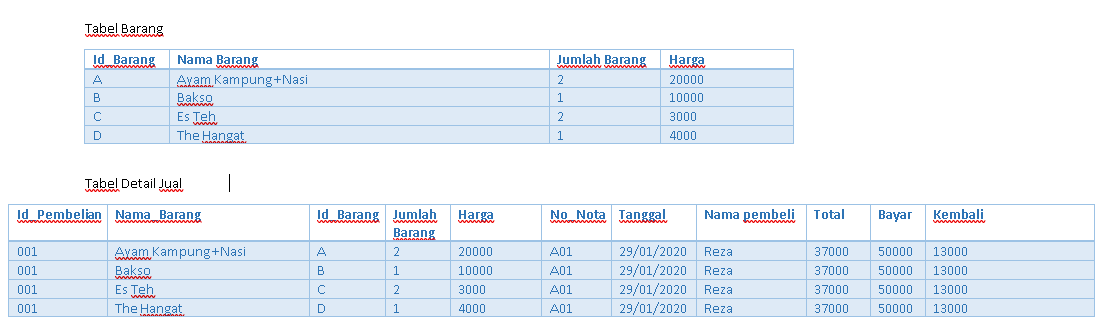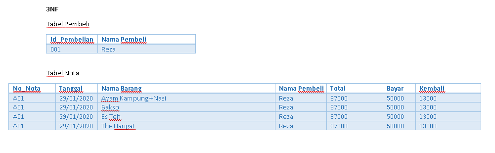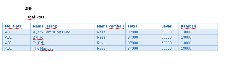 - Fifth Normal Form (5NF)Tahapan ini dilakukan untuk mengatasi terjadinya join dependent pemecahan relasi menjadi dua sehingga relasi tersebut tidak dapat digabungkan kembali menjadi satu.