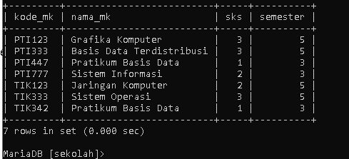 dan ketik “SELECT * FROM barang;” untuk menampilkan tabel barang.